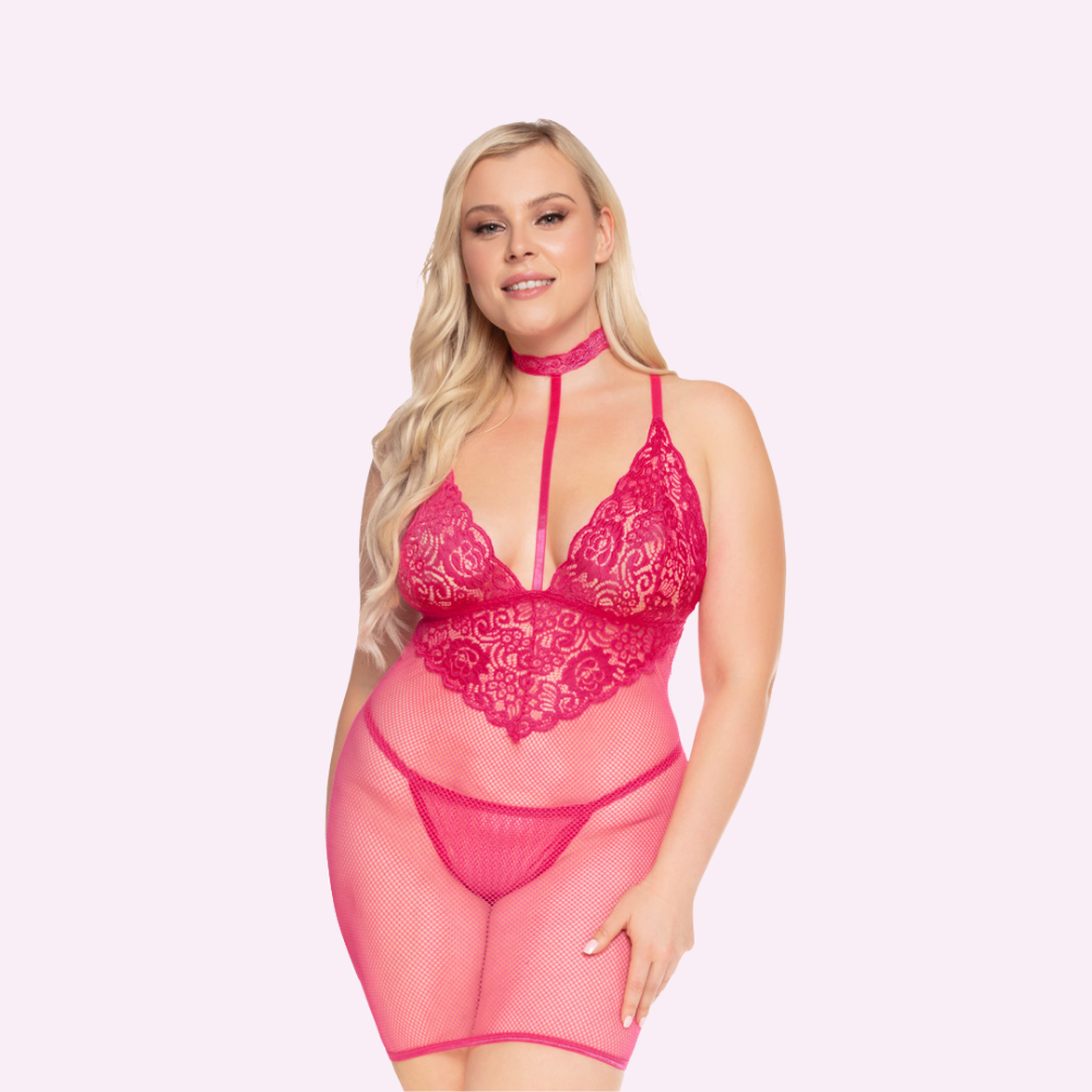 Slip into something sheer with this collared slip and matching G-string set. The stretch fishnet body of this slip gives a preview of your curves, while the lace bodice and collar leave more fun to uncover. The matching g-string coordinates beautifully for an ultra-sexy style for any occasion.